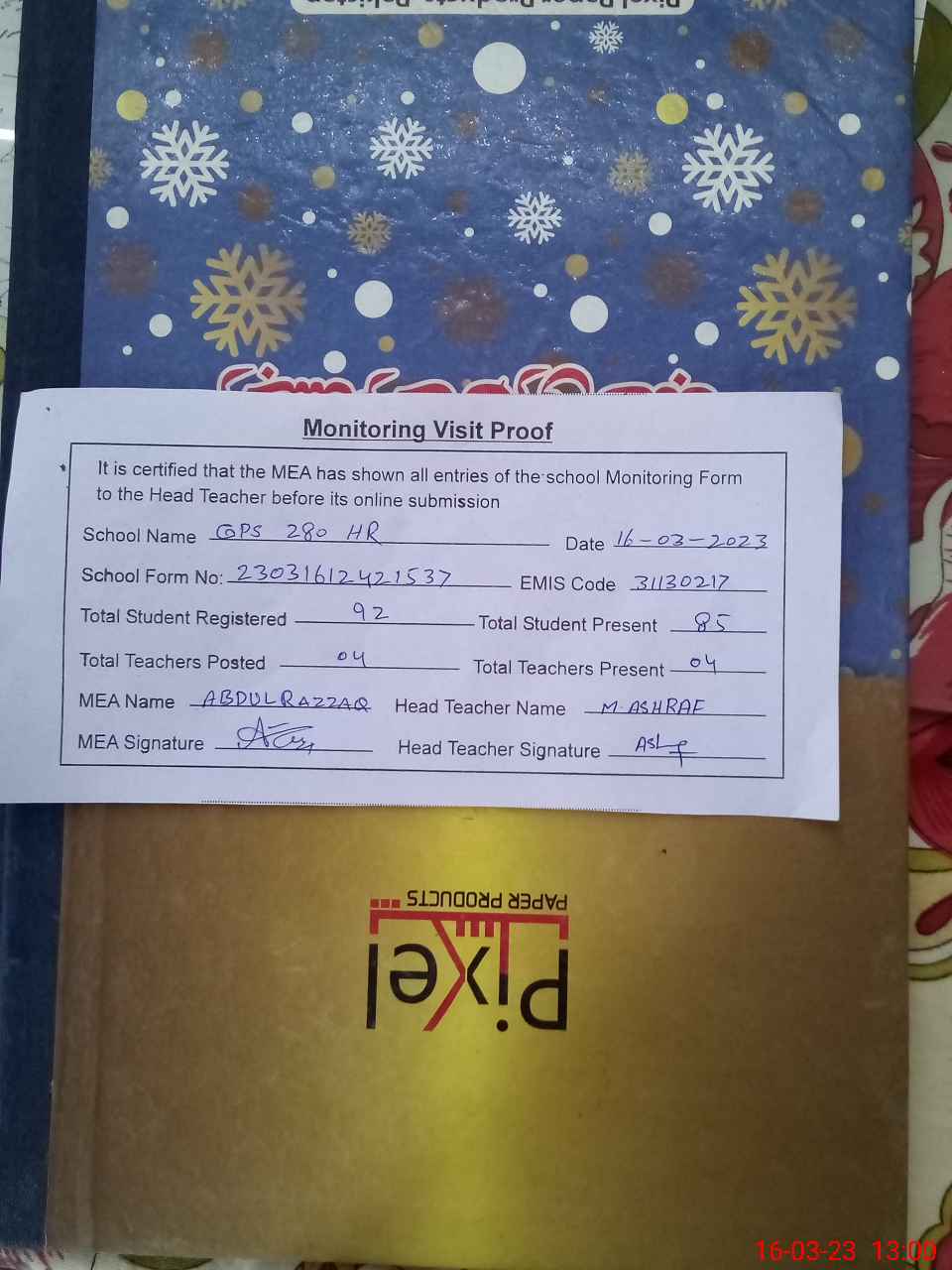 | EMIS Code: 31130217 | Name of School: GPS CHAK NO 280 HR | |||