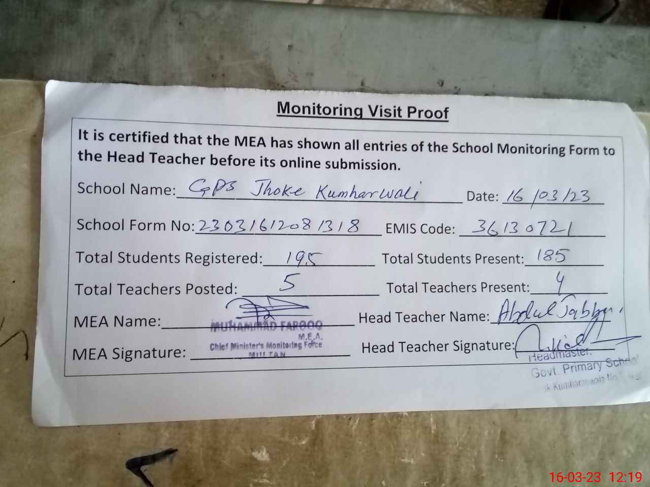 | Attendance Register | Head Teacher | MEA with School | Visit Proof |