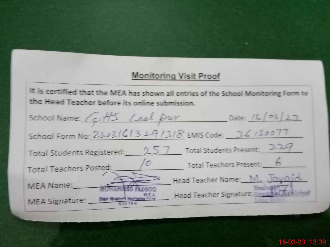 | Attendance Register | Head Teacher | MEA with School | Visit Proof |