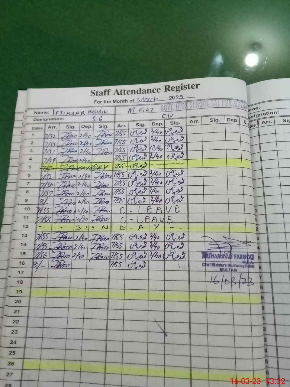 | CNIC | Full Name | Designation | R/C | Absence During Last Calender Month |