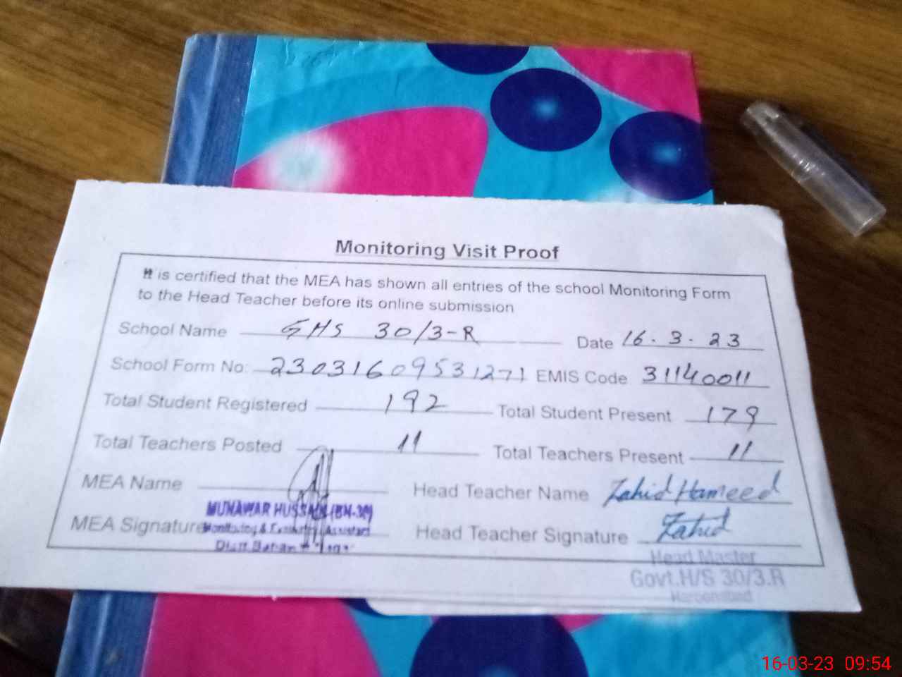 | EMIS Code: 31140011 | Name of School: GHS CHAK 30/3R | |||