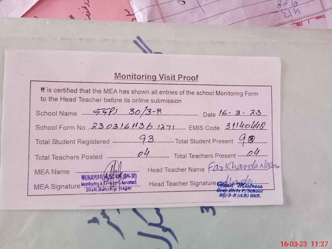 | Attendance Register | Head Teacher | MEA with School | Visit Proof |