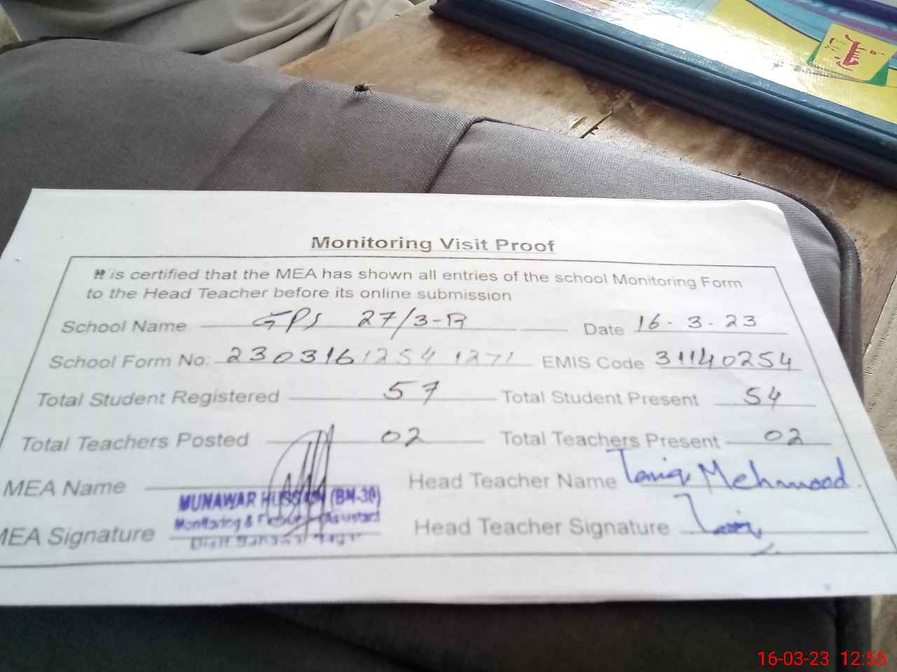 | Attendance Register | Head Teacher | MEA with School | Visit Proof |