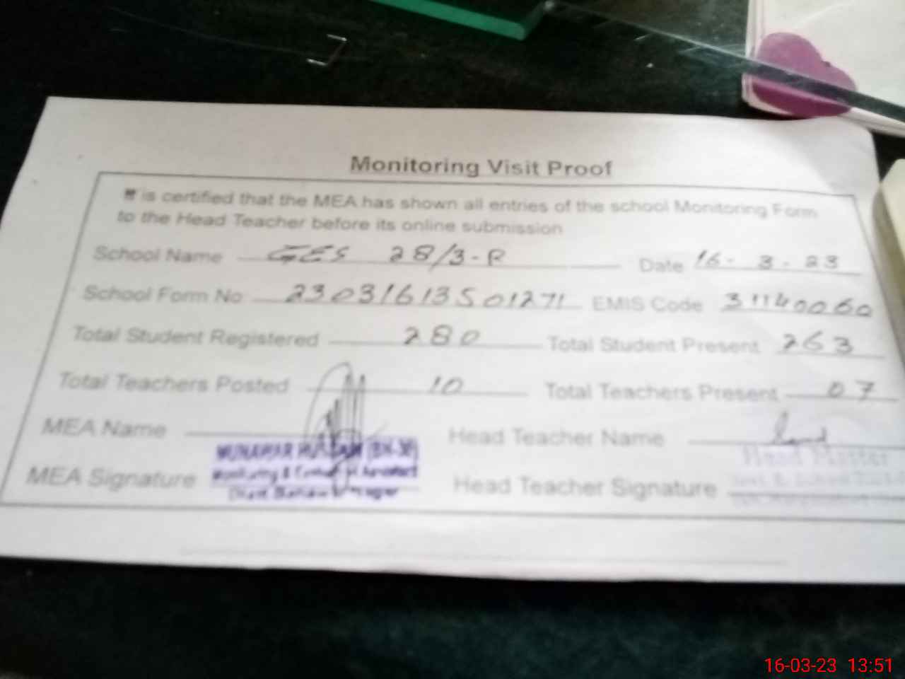 | Attendance Register | Head Teacher | MEA with School | Visit Proof |