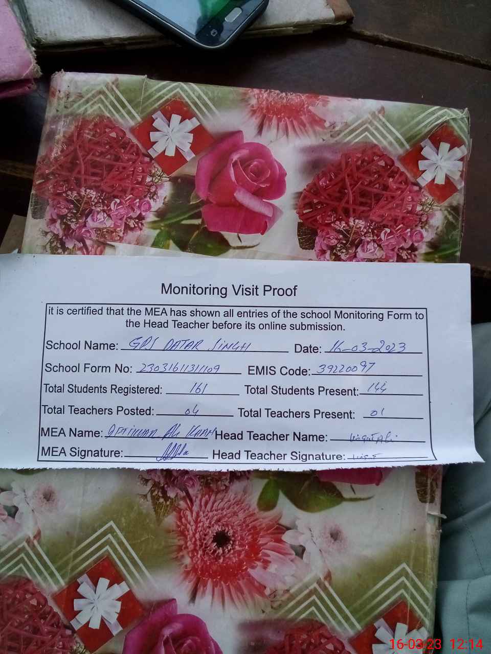| Attendance Register | Head Teacher | MEA with School | Visit Proof |