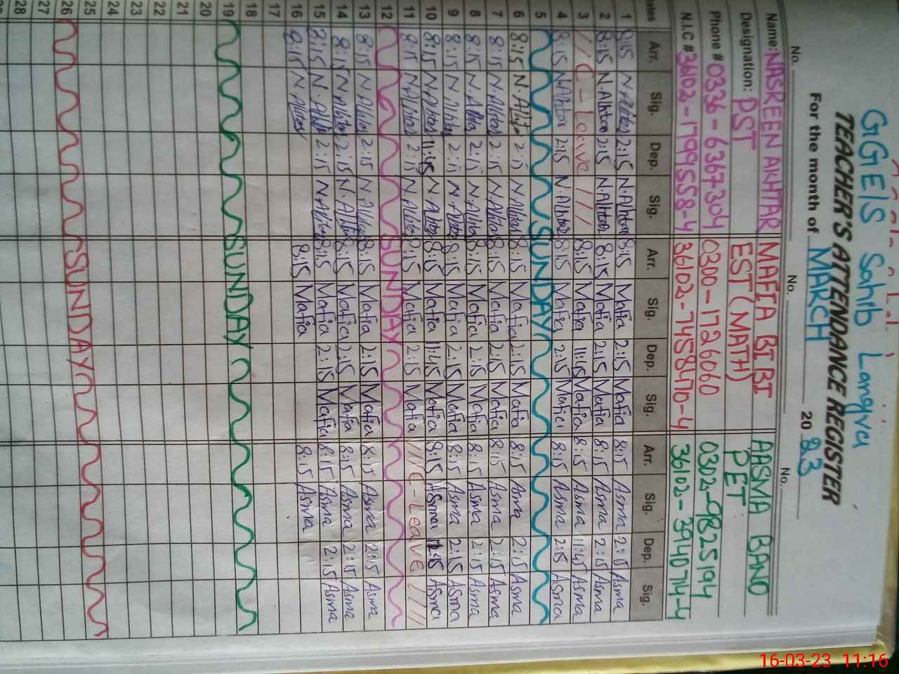 | CNIC | Full Name | Designation | R/C | Absence During Last Calender Month |