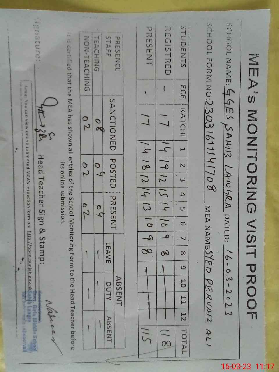 | Attendance Register | Head Teacher | MEA with School | Visit Proof |