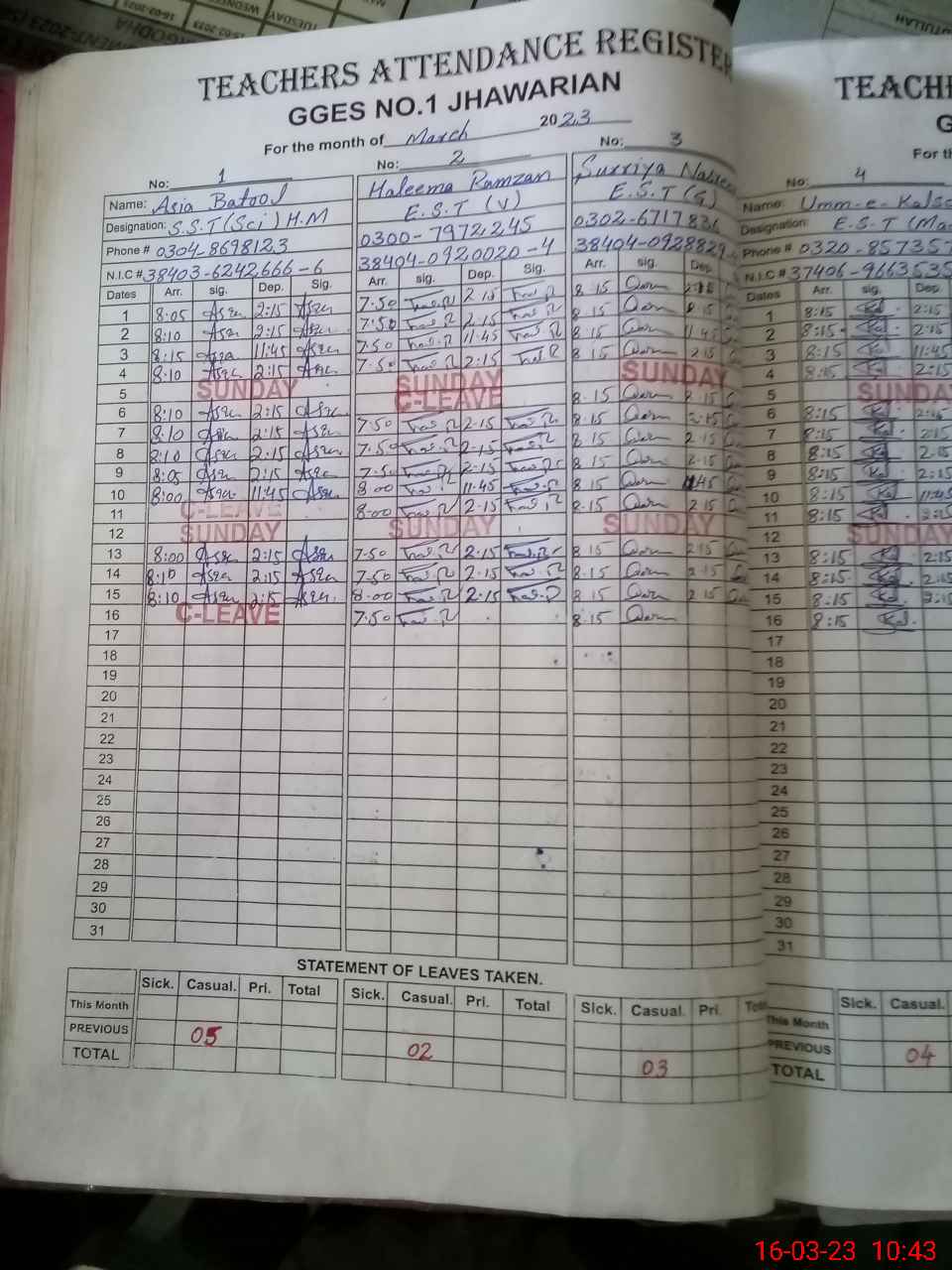 | CNIC | Full Name | Designation | R/C | Absence during last cal. month |