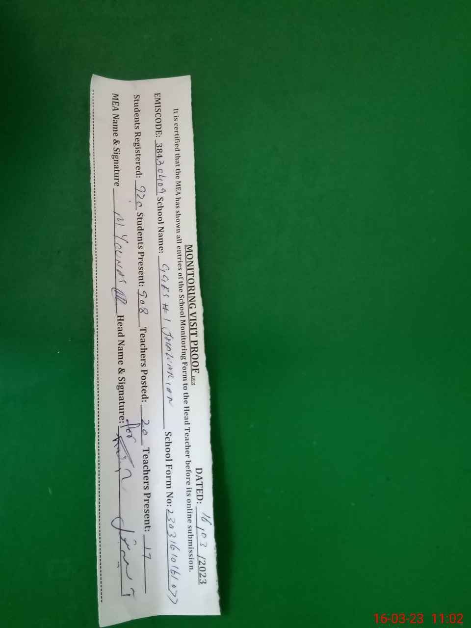 | Attendance Register | Head Teacher | MEA with School | Visit Proof |