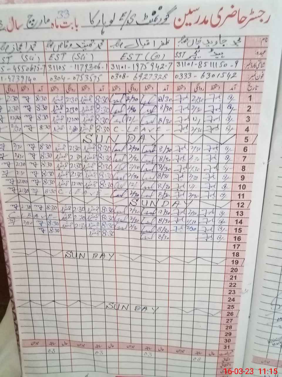 | CNIC | Full Name | Designation | R/C | Absence During Last Calender Month |
