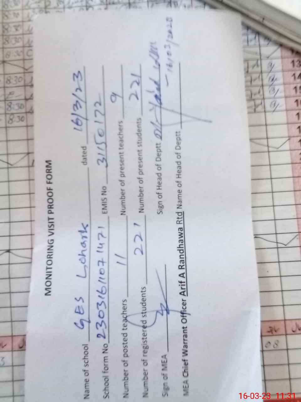 | Attendance Register | Head Teacher | MEA with School | Visit Proof |