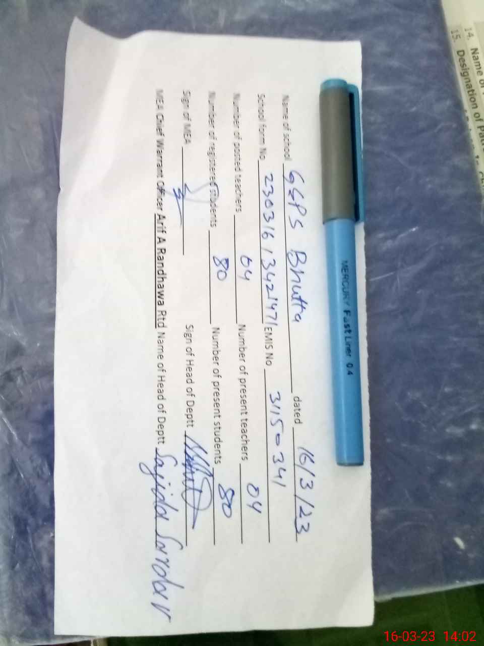 | EMIS Code: 31150341 | Name of School: GGPS BHUTTA | |||