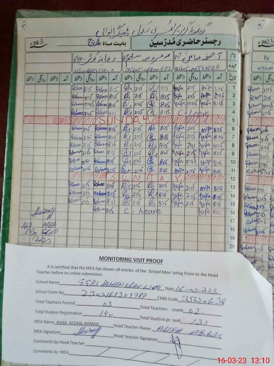 | Attendance Register | Head Teacher | MEA with School | Visit Proof |