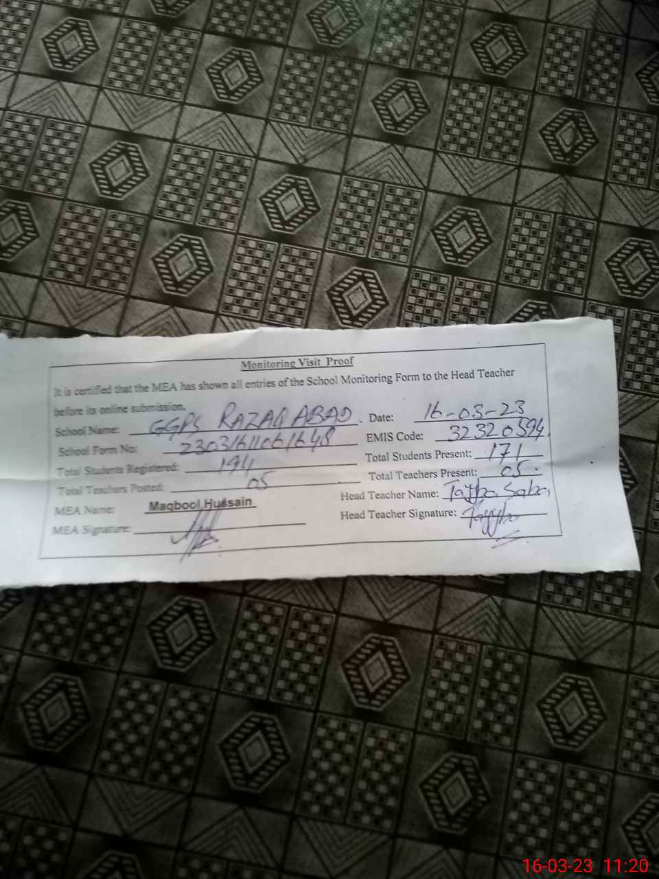| Attendance Register | Head Teacher | MEA with School | Visit Proof |