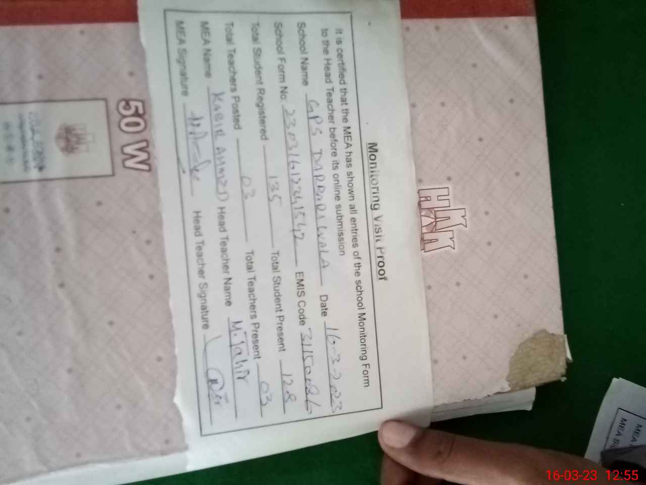 | Attendance Register | Head Teacher | MEA with School | Visit Proof |
