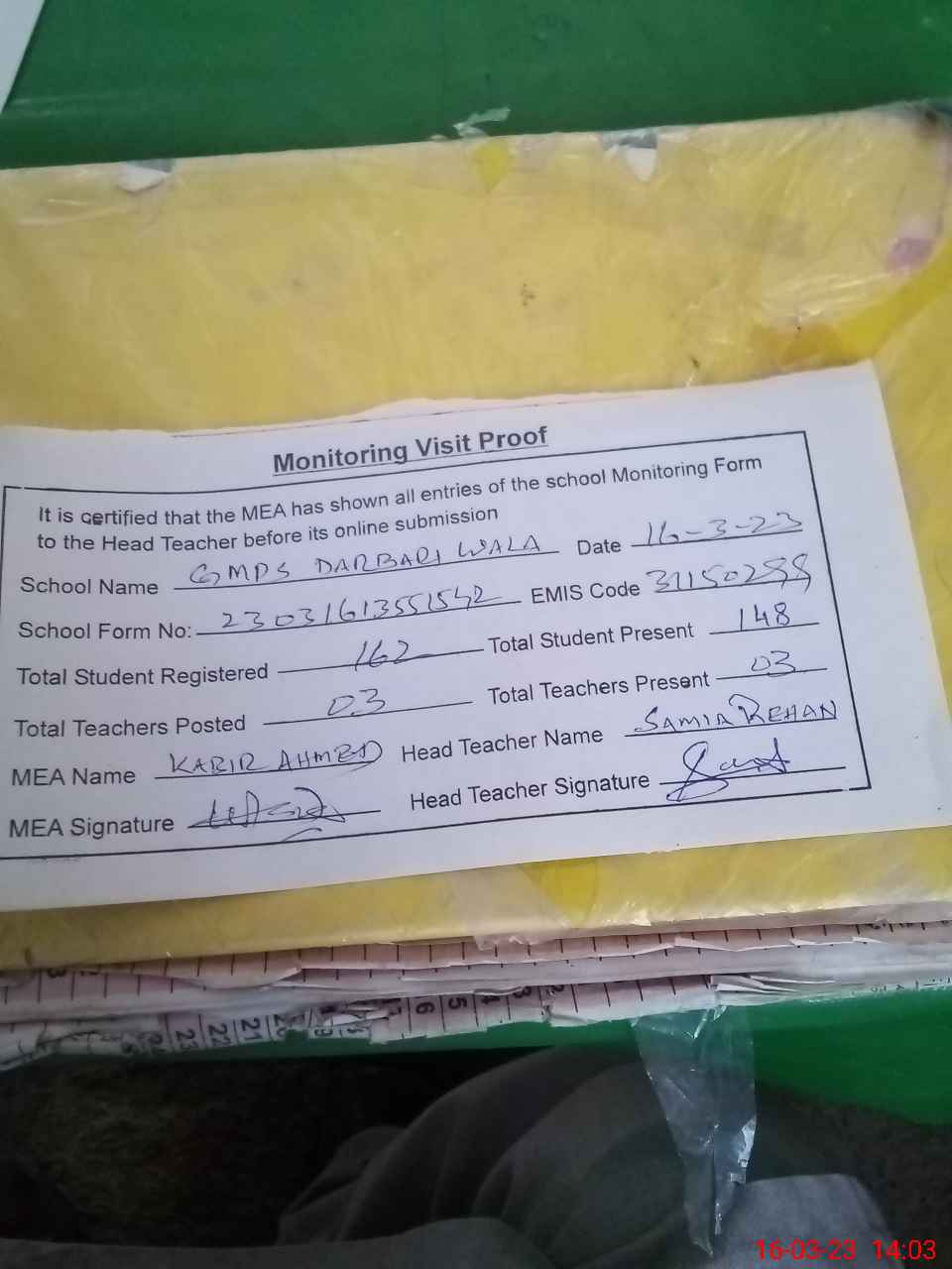 | Attendance Register | Head Teacher | MEA with School | Visit Proof |