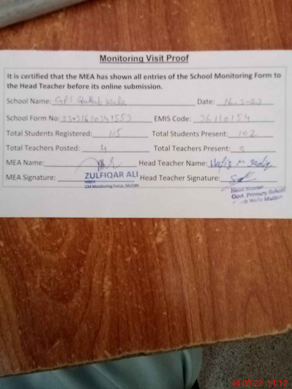 | EMIS Code: 36110154 | Name of School: GPS QUTTUB WALA ISMAIL ABAD P/O MULTAN | |||