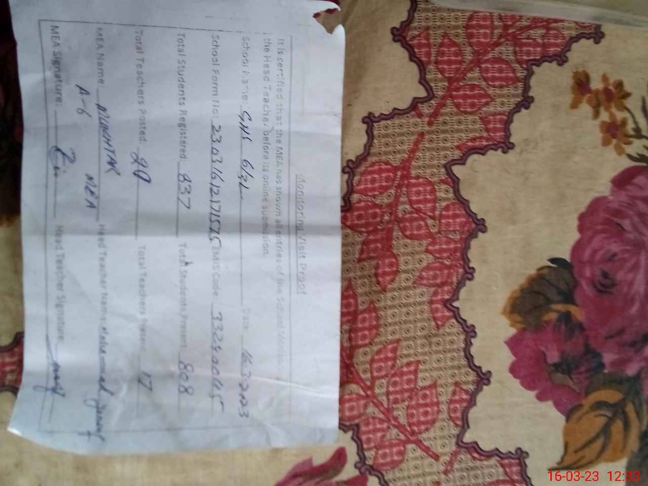 | Attendance Register | Head Teacher | MEA with School | Visit Proof |