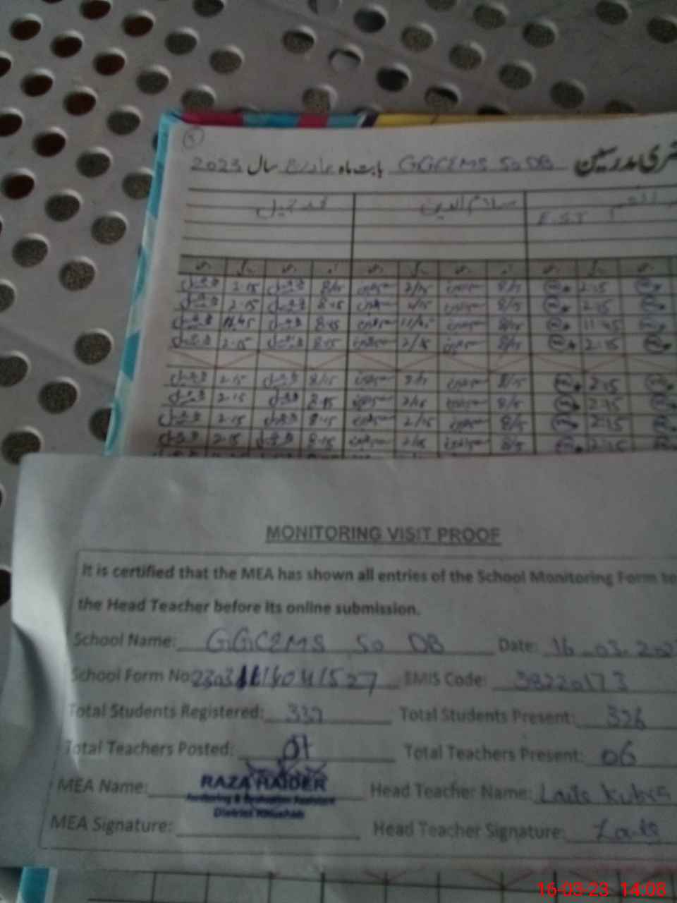 | Attendance Register | Head Teacher | MEA with School | Visit Proof |