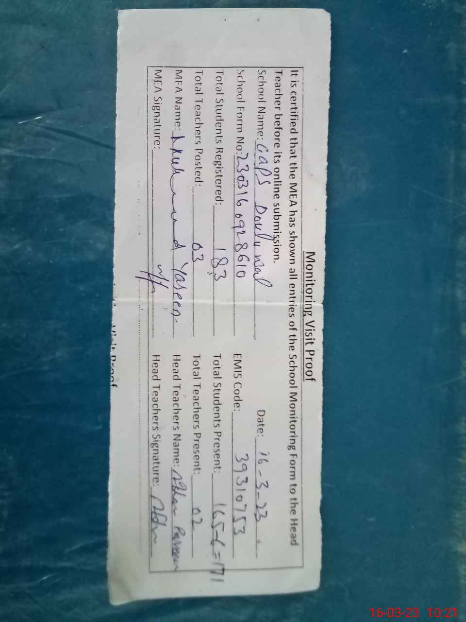 | Certified that this School was Inspected by the Undersigned MEA/DMO Today and the Information Stated Above is as Per Record. | |||||