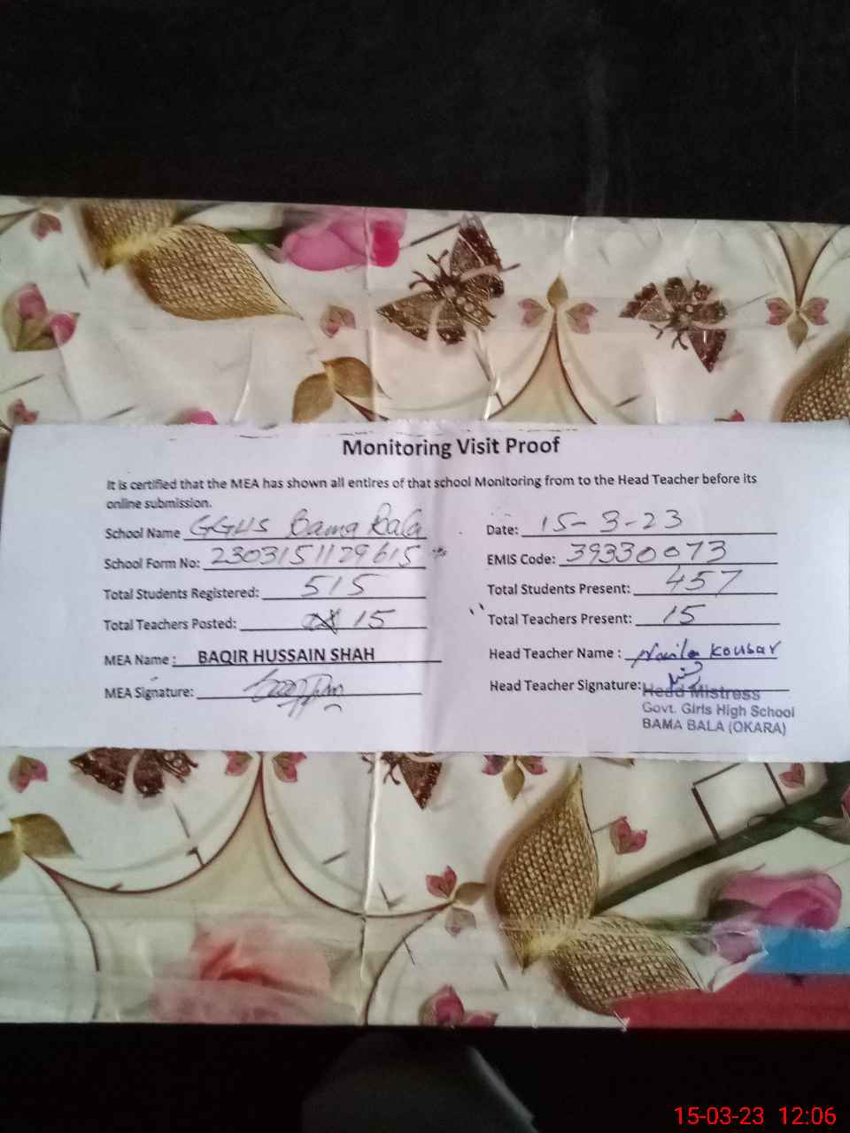 | Certified that this School was Inspected by the Undersigned MEA/DMO Today and the Information Stated Above is as Per Record. | |||||