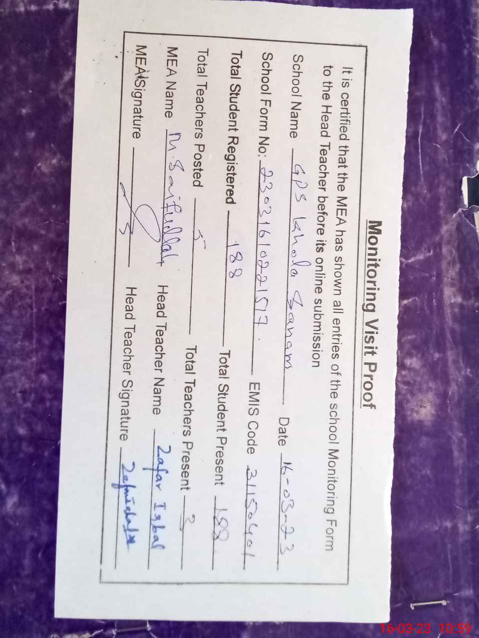 | Attendance Register | Head Teacher | MEA with School | Visit Proof |