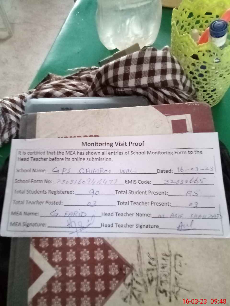 | Attendance Register | Head Teacher | MEA with School | Visit Proof |