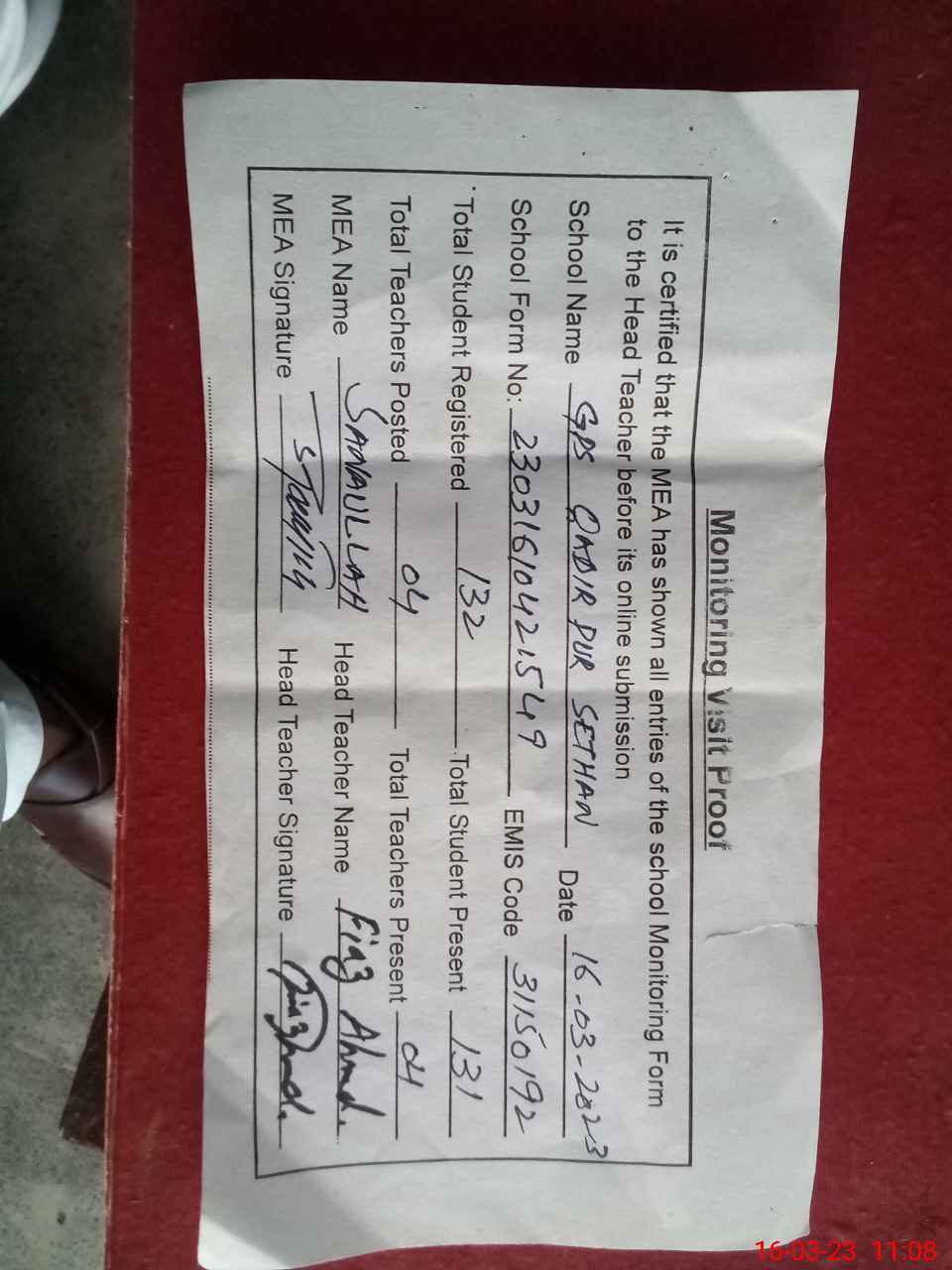 | EMIS Code: 31150192 | Name of School: GPS QADIR PUR SETHAN | |||