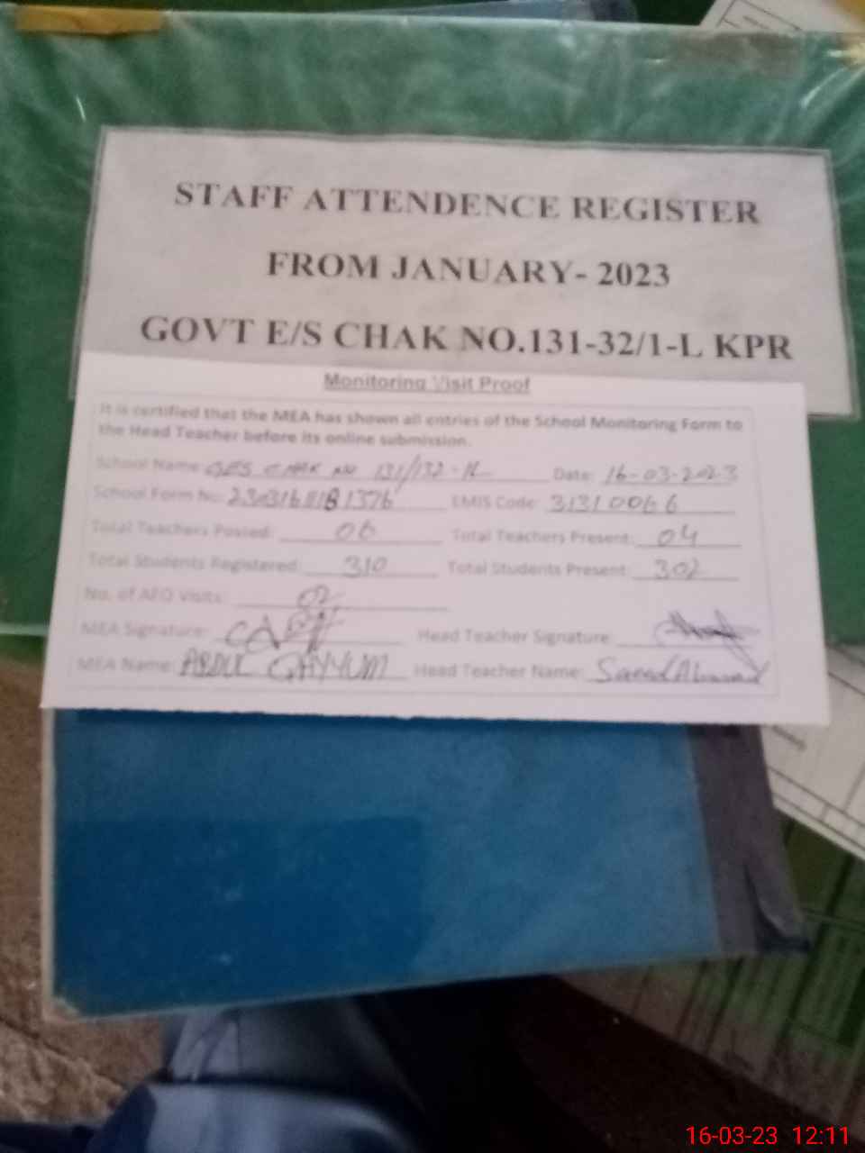 | Attendance Register | Head Teacher | MEA with School | Visit Proof |