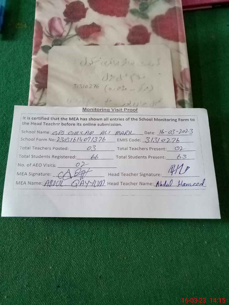 | EMIS Code: 31310276 | Name of School: GPS GHULAM ALI MARIL | |||