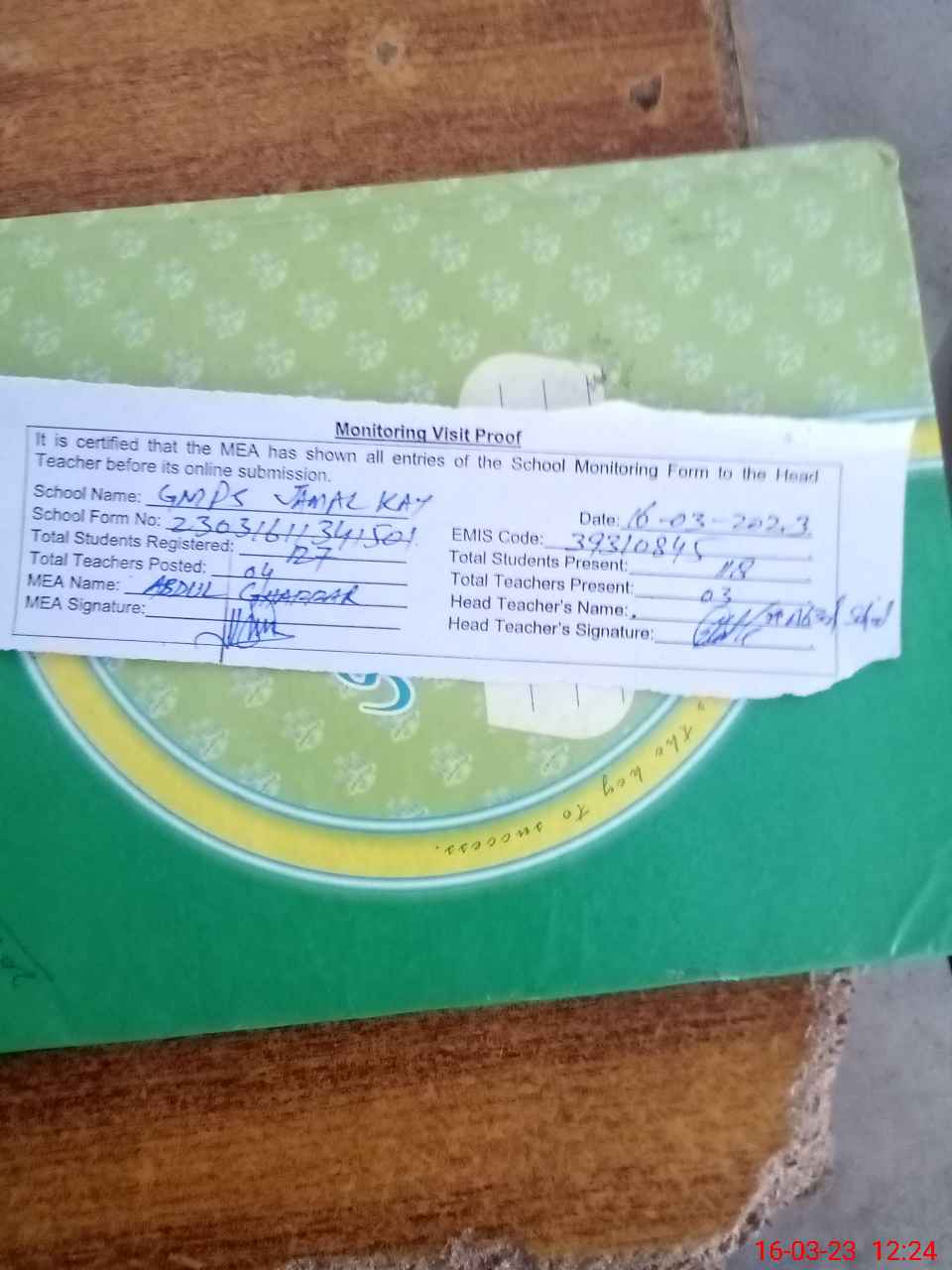 | Attendance Register | Head Teacher | MEA with School | Visit Proof |