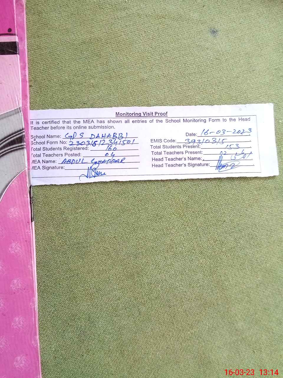 | EMIS Code: 39310315 | Name of School: GPS DHABBI | |||