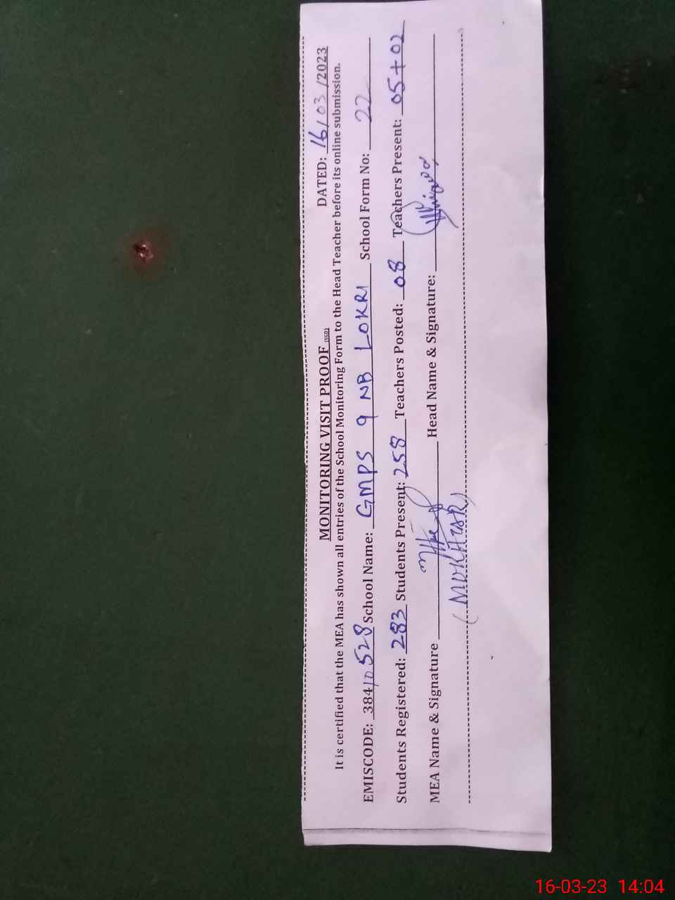 | Attendance Register | Head Teacher | MEA with School | Visit Proof |