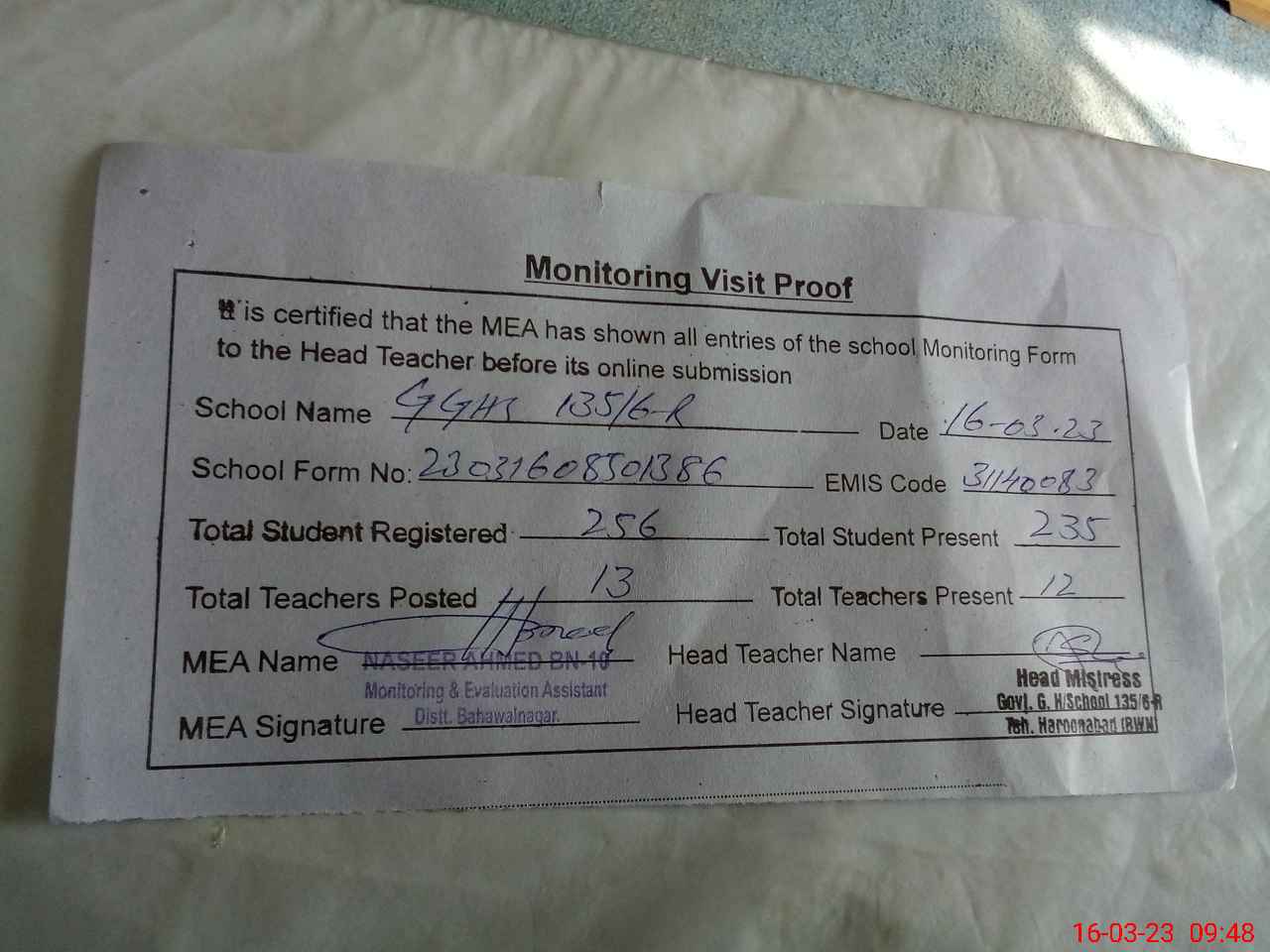 | EMIS Code: 31140083 | Name of School: GGHS CHAK NO 135/6-R | |||
