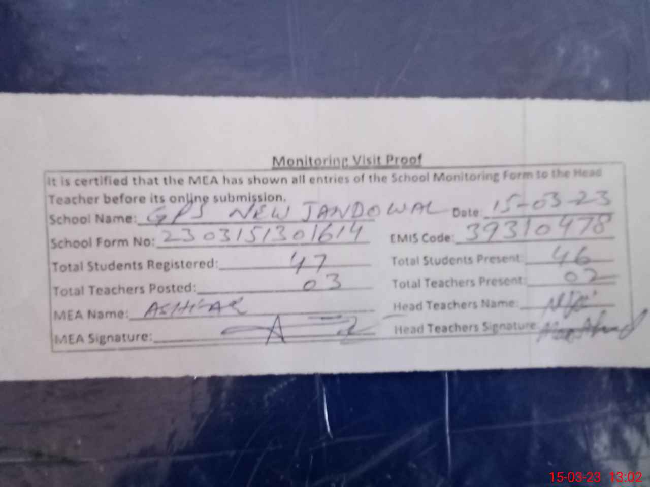 | EMIS Code: 39310478 | Name of School: GPS NEW JANDOWAL | |||