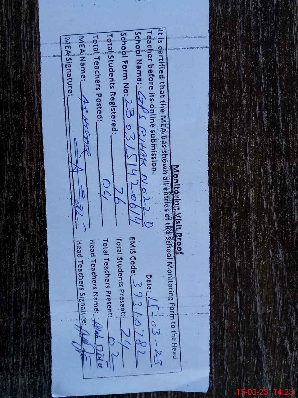 | Attendance Register | Head Teacher | MEA with School | Visit Proof |