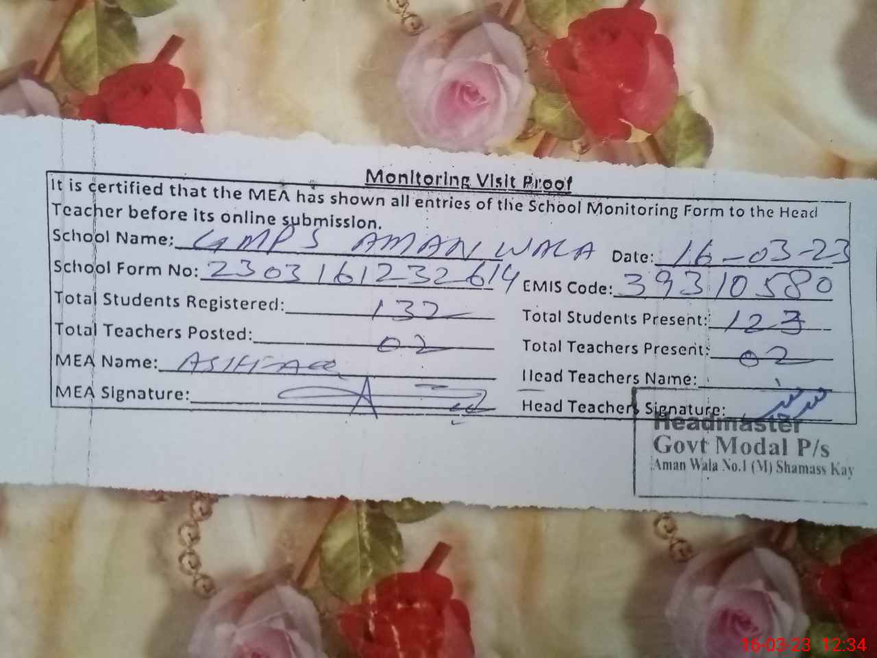 | Attendance Register | Head Teacher | MEA with School | Visit Proof |