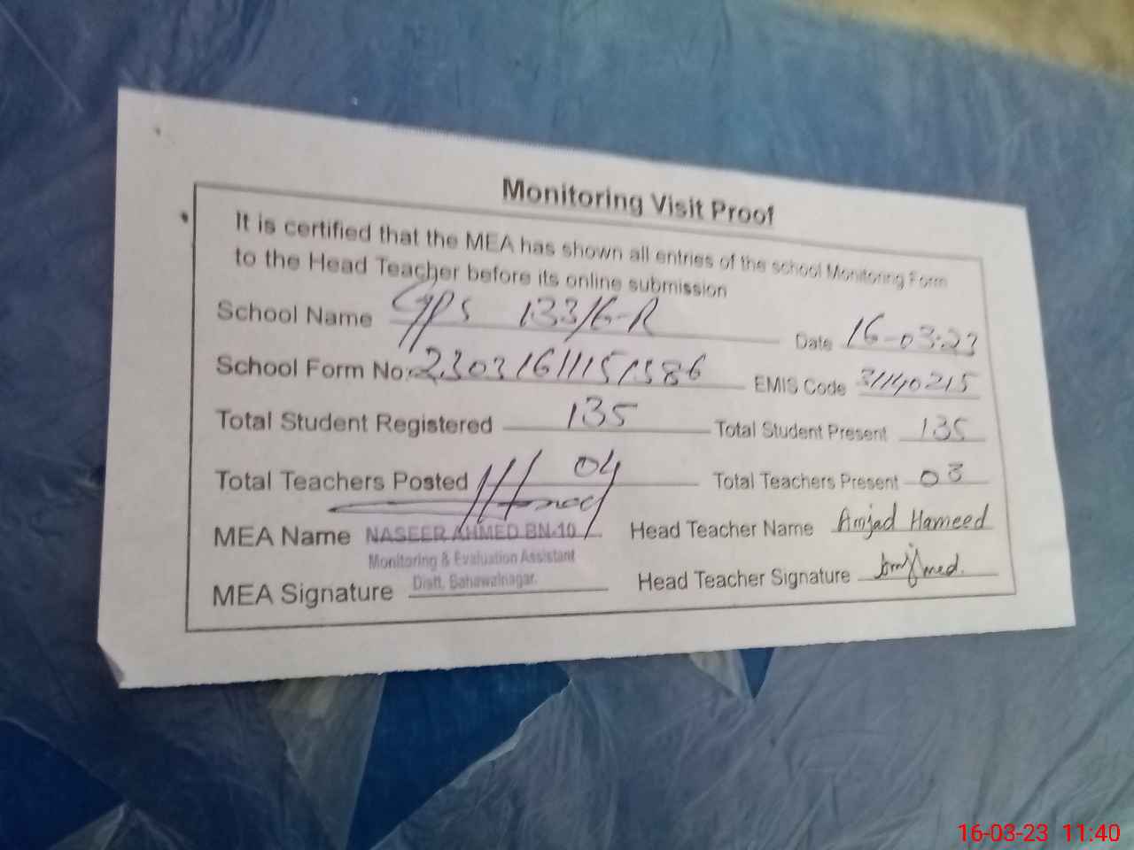 | Attendance Register | Head Teacher | MEA with School | Visit Proof |