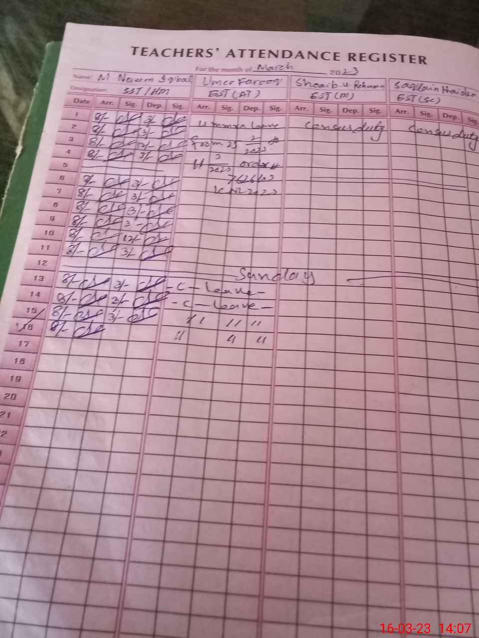 | CNIC | Full Name | Designation | R/C | Absence During Last Calender Month |