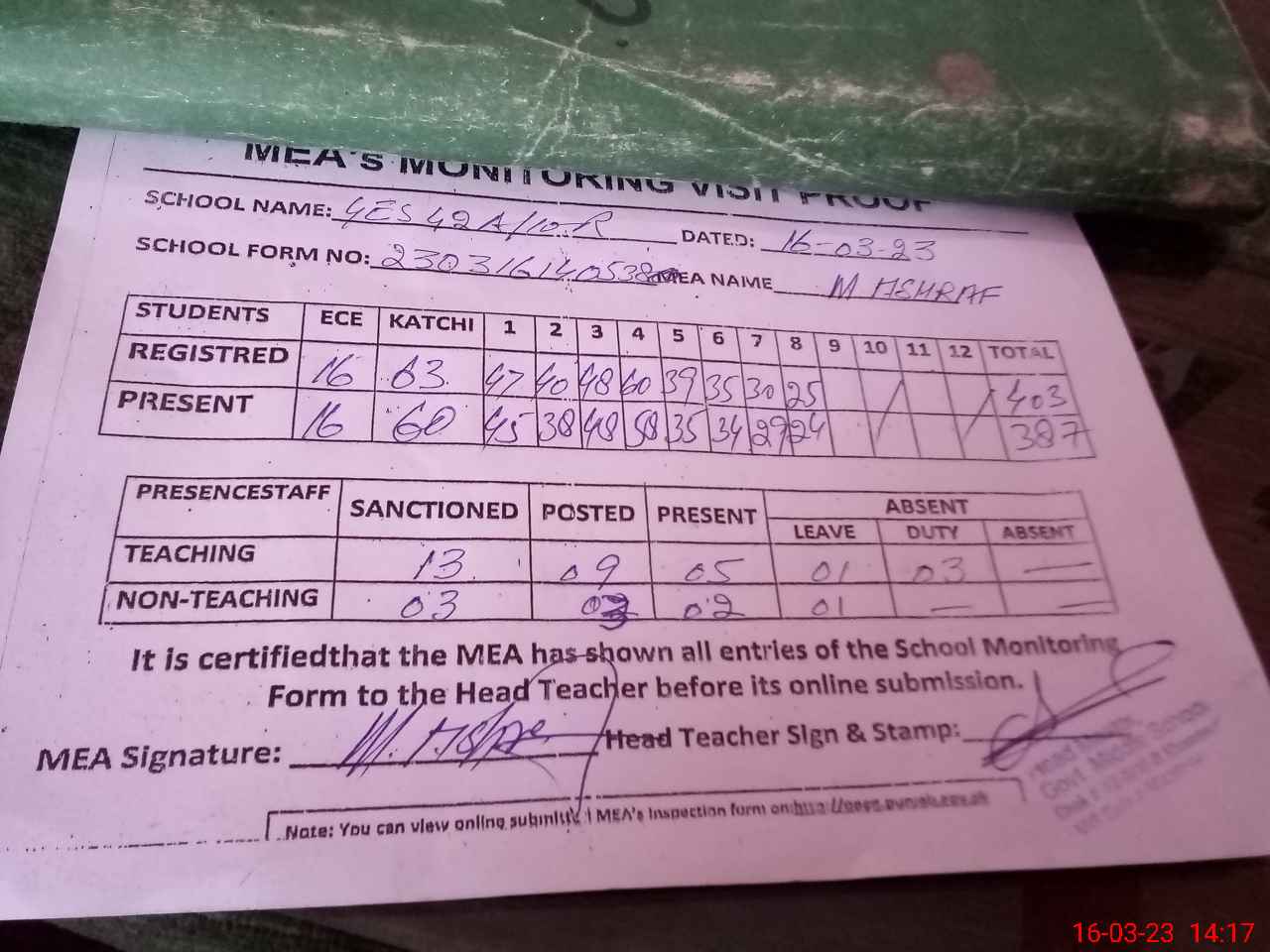 | Attendance Register | Head Teacher | MEA with School | Visit Proof |