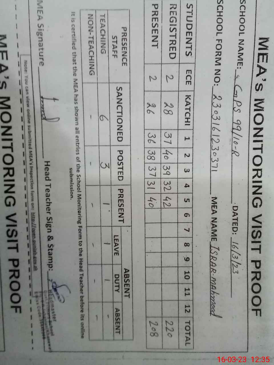 | Attendance Register | Head Teacher | MEA with School | Visit Proof |
