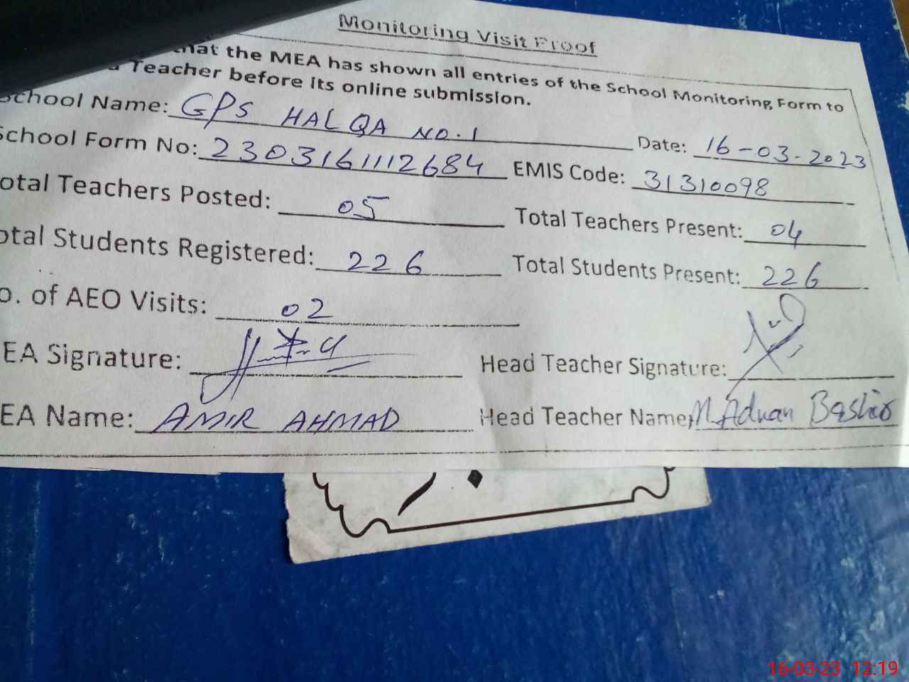 | EMIS Code: 31310098 | Name of School: GPS MC HALQA NO 1 | |||