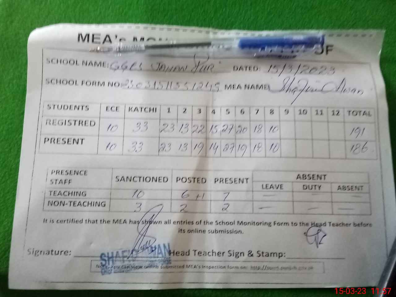 | Attendance Register | Head Teacher | MEA with School | Visit Proof |