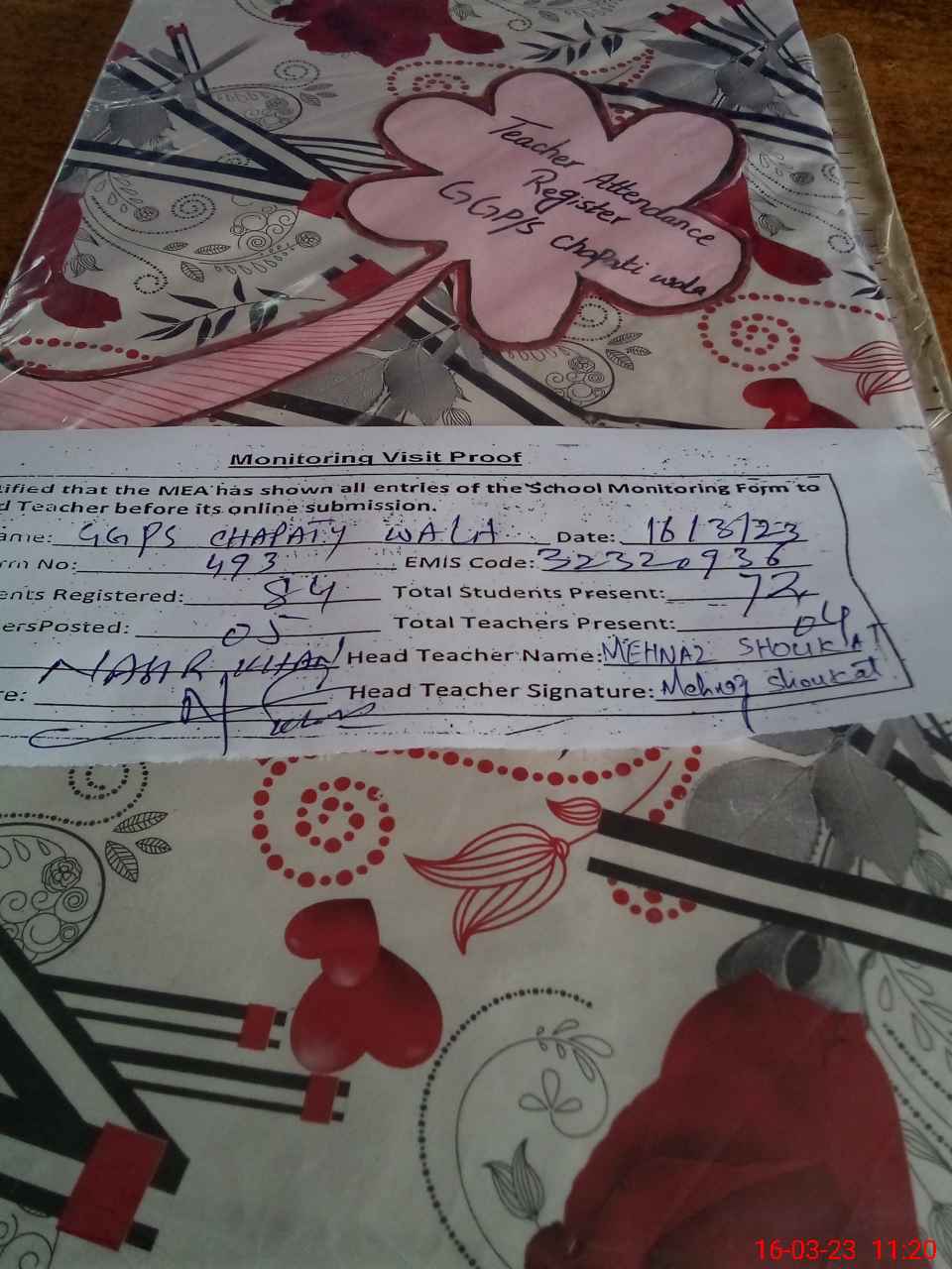| Attendance Register | Head Teacher | MEA with School | Visit Proof |