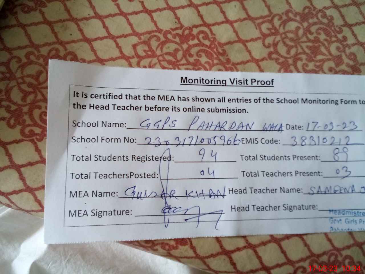 | Attendance Register | Head Teacher | MEA with School | Visit Proof |