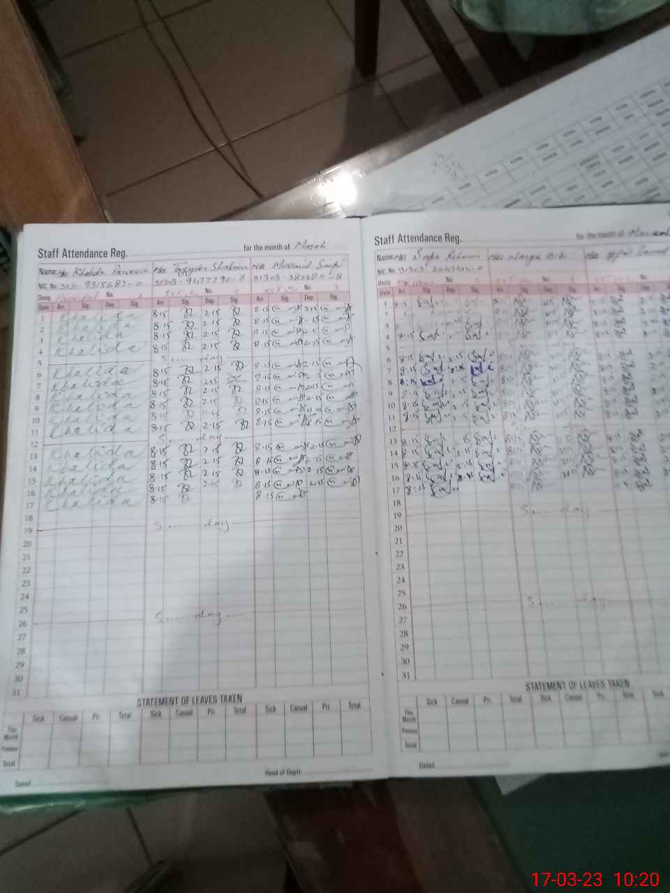 | CNIC | Full Name | Designation | R/C | Absence During Last Calender Month |