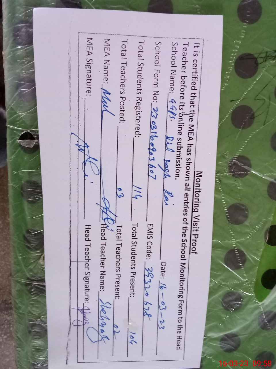 | Attendance Register | Head Teacher | MEA with School | Visit Proof |