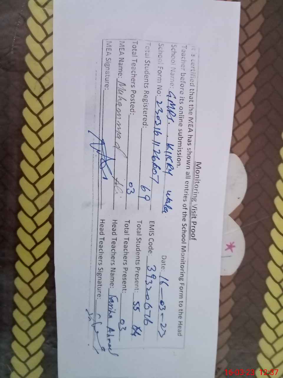 | EMIS Code: 39320676 | Name of School: GMPS KIKRI WALA | |||