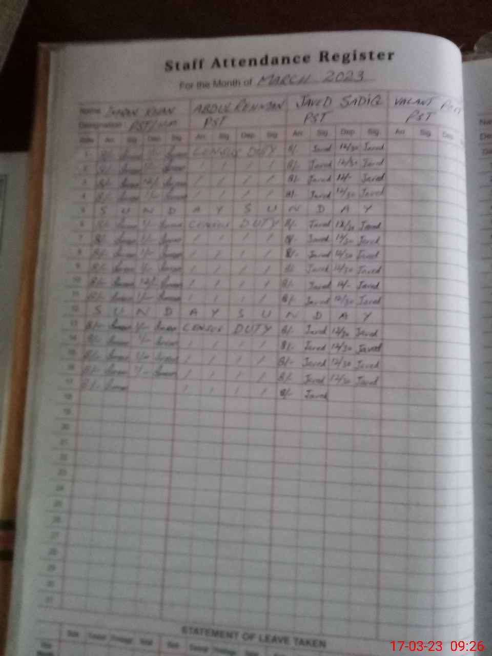 | Leave | Duty | Absent | Maternity | Medical | Ex- Pak |
