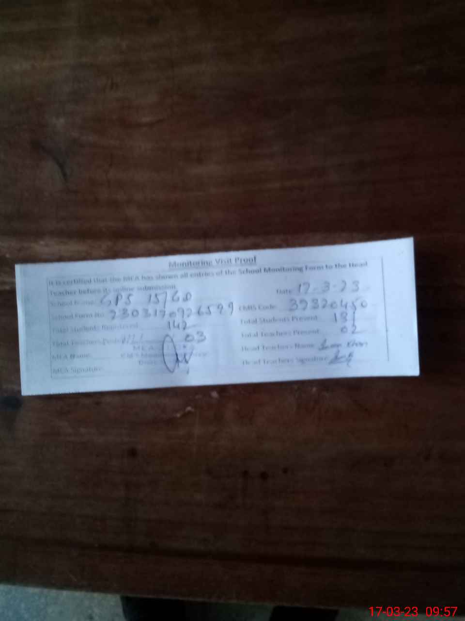 | Attendance Register | Head Teacher | MEA with School | Visit Proof |